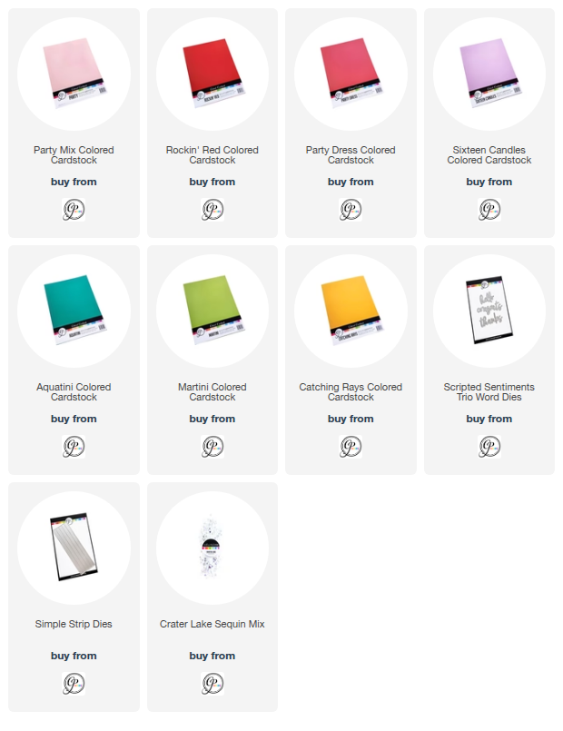 For my card, I chose to play with the Party colors—bold, cheerful, and full of personality. I used Catching Rays, Rockin' Red, Party Dress, Sixteen Candles, Aquatini and Martini cardstocks. I used the Simple Strip Die to cut clean, even strips of cardstock, layering them into a rainbow circle for instant impact with very little effort. This die makes quick work of backgrounds and is perfect for showcasing color combinations.